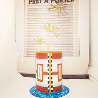 Table en rotin des années 80 éditée par Roche Bobois. Plateau en frêne et pied en rotin recouvert de vannerie. Peinture à l'huile Trompe-l'œil et vernis brillant avec laque blanche et noire, ainsi qu'une peinture dégradée. Dimensions : 77 x 123 x 123 / avec rallonge 77 x 123 x 186 cm